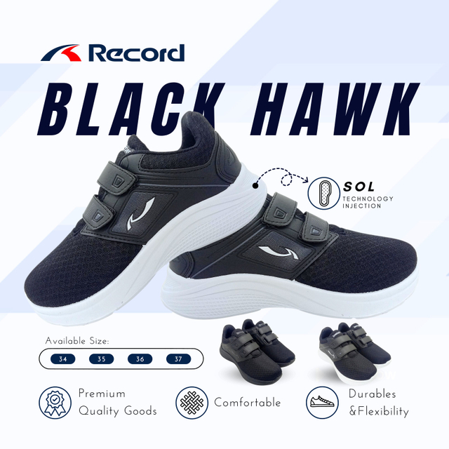 RECORD HAWK SEPATU ANAK TK-SMP 4-13 TAHUN PEREKAT FULL BLACK HITAM PUTIH SEKOLAH 30-37 COWOK/CEWEK