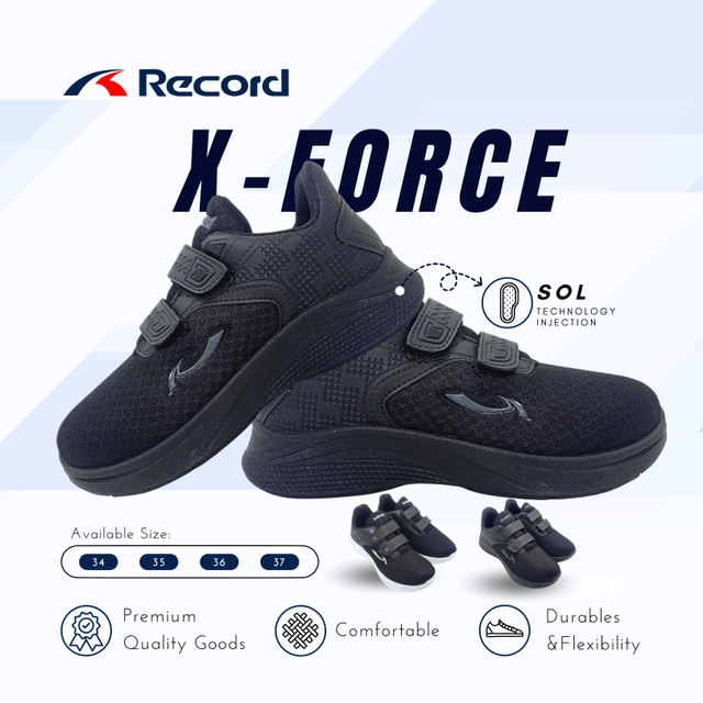 RECORD XFORCE SEPATU SEKOLAH ANAK TK SD SMP 4-13THN ALL BLACK HITAM PUTIH 30-37 PEREKAT COWO CEWE